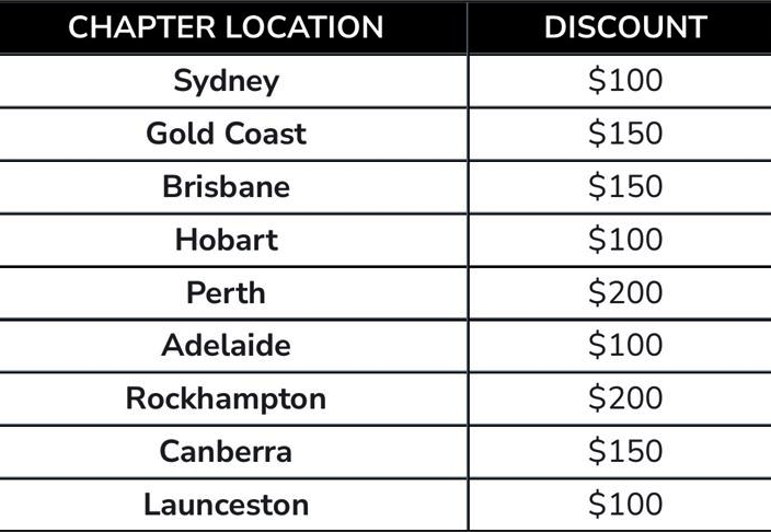 If you are travelling interstate, we have calculated discounts based on average flight costs from major cities. The table below has the discount on a camp ticket if travelling from these Chapter locations.