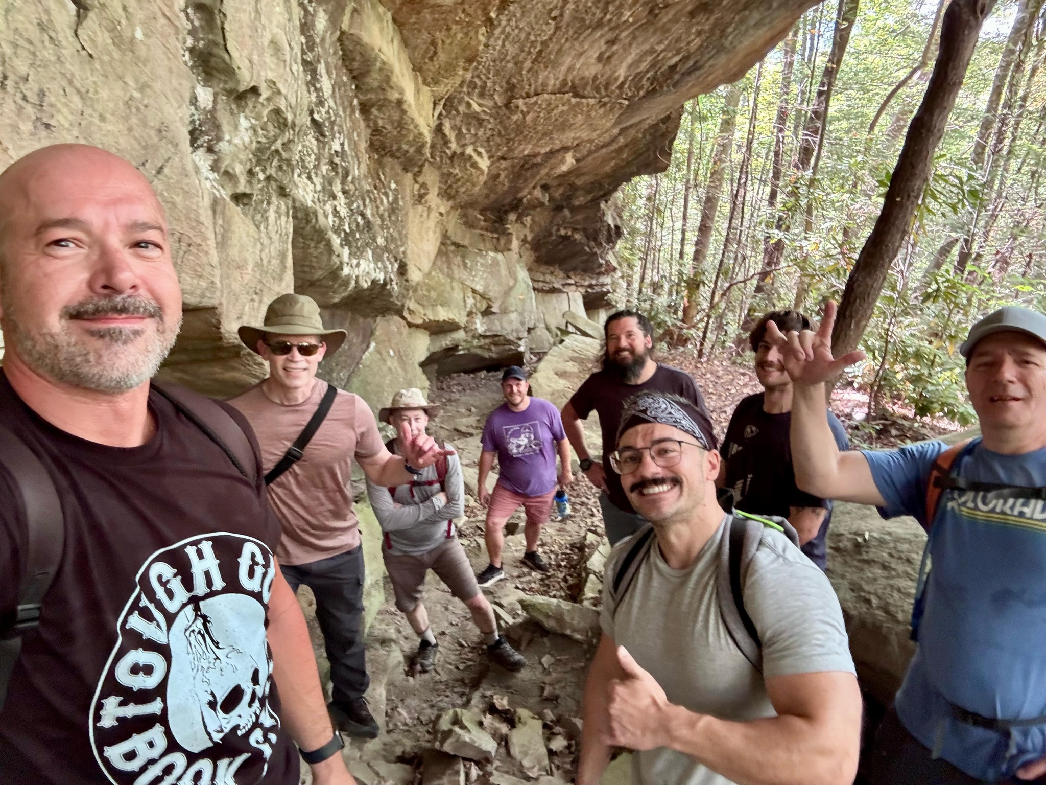 Friday night was an opportunity for everyone to unwind, introduce ourselves and get our bearings. Bratwurst and all the fixings matched with a few pints made for an easy transition into camp life. There was representation from Boston, MA, Cincinnati, OH, Chicago, IL, Greenville, SC, Long Island, NY, Portland, OR and Washington, DC. Saturday started with breakfast and it was decided that we would climb Knobby Rock which had a breathtaking overlook directly behind the main cabin. Camp Blanton is located in the Blanton Forest State Nature Preserve which offers 3,124 acres of old growth and second-growth forests. Some of the trees were up to four feet in diameter. The trail system offered two loops, both leading to the overlook. The path ended with a spectacular view of the Blue Mountains and the surrounding area. Our whole group chose the first one to ascend, and the more adventurous opted to take the second loop down. This offered stops at the Sand Cave and the Maze and the Watts Creek and Big Branch watersheds.